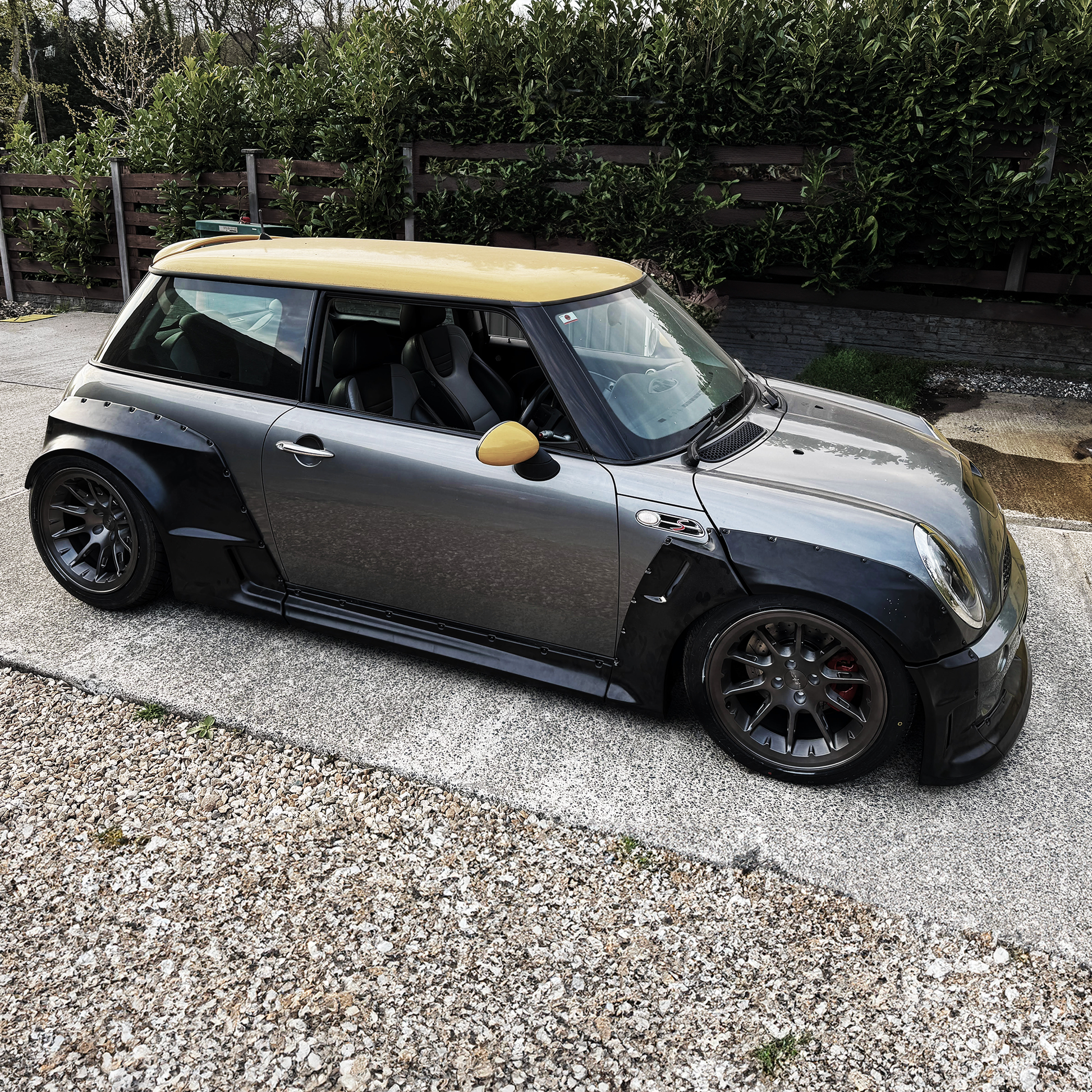 The most radical widebody kit for the Mini Cooper S R50-R53 2000-2006. It was created thanks to our chief designer's love for this car. Initially, the project was conceived as a single, exclusive example of a body extension. But having received an excellent response among fans of the brand and this model, it was decided to make a full-fledged series and please the community with a quality product. Aggressive design will not leave anyone indifferent. The air intakes are reminiscent of elements of sports and racing cars. If desired, you can add a spoiler and carbon fins on the hood to complete the look.